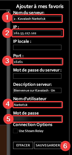 Sélectionnez le serveur Kavalash PVE, encodez vos informations de connexion (Pseudo et Mot de passe), et cliquez sur Connexion.